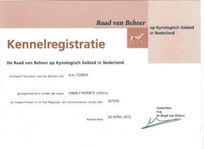 Sinds April 2012 is onze familiekennel dan ook bij de Raad van Beheer